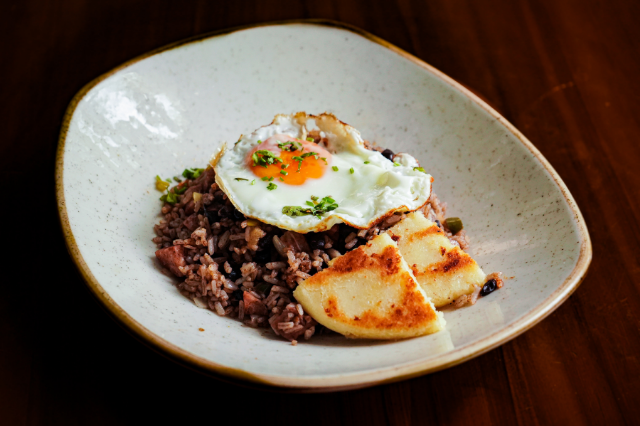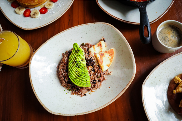 Arroz, frijoles, hogao, plátano amarillo y aguacate tajado acompañado con arepa y jugo del día.