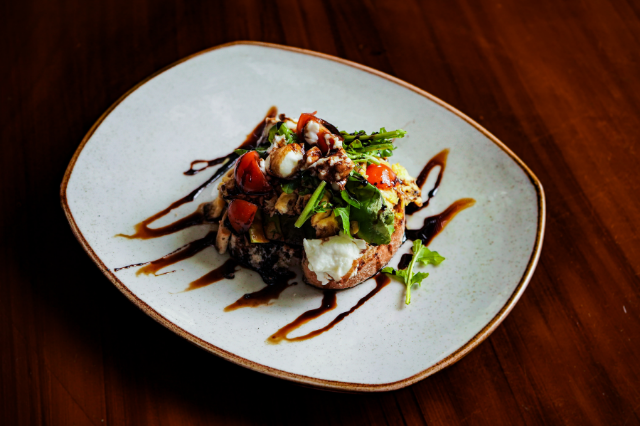 Tostada de pan artesanal con huevos al gusto, aguacate, mix de verdes, tomate cherry, cebolla encurtida, queso bocconcini, reducción de balsámico y jugo del día.
