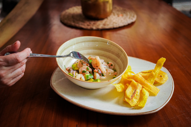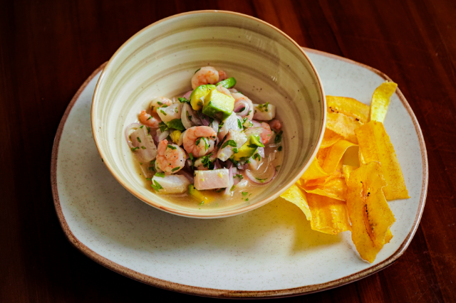 Pescado y camarón en zumo de limón y naranja, cebolla roja, aguacate, cilantro, yerbabuena, aceite de oliva acompañado de chips de plátano.
