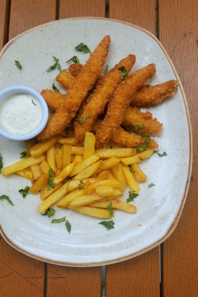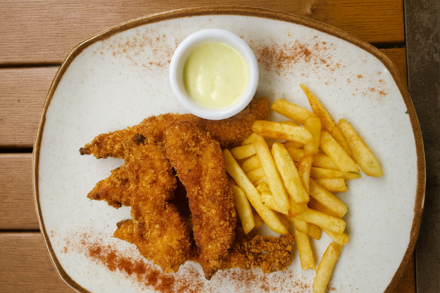 Crujientes deditos de pescado empanizados, servidos con papas a la francesa doradas y nuestra exclusiva salsa artesanal de la casa.