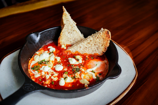 Huevos cocidos lentamente en nuestra salsa de tomates horneados con especies y pimientos, queso costeño, suero costeño y cilantro acompañado de tostadas de pan artesanal y jugo del día.