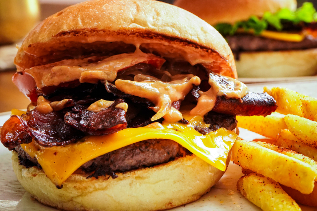 130gr de carne de res premium, pan artesanal, doble tocineta crocante y queso cheddar en salsa de la casa, acompañada de papas a la francesa