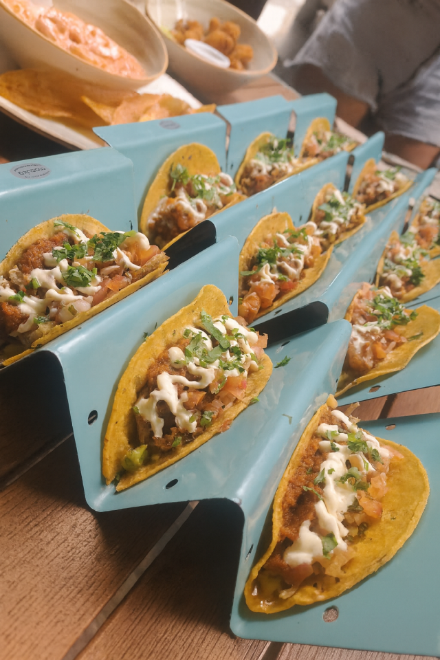 3 Tacos acompañados de guacamole, pescado fresco apanado, salsa chipotle hecha en casa, pico de gallo y suero costeño