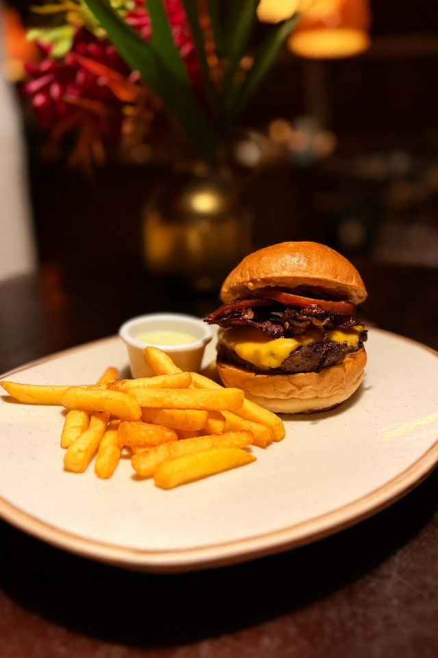 130gr de carne de res premium, pan artesanal, tocineta crocante, queso cheddar, cebolla caramelizada, tomate a las especias, salsa de la casa, acompañada de papas a la francesa