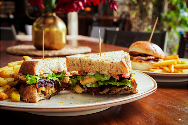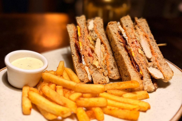 Sandwich de pollo a la parrilla en pan artesanal servido con tocineta, lechuga, tomates frescos, queso mozzarella y miel mostaza de la casa acompañada de papas a la francesa.