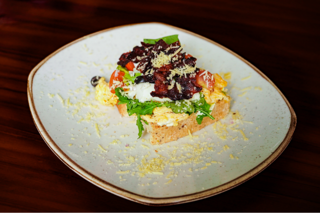 Tostada de pan artesanal con huevos al gusto, tocineta, guacamole, mix de verdes, tomate cherry, cebolla encurtida, queso bocconcini, queso parmesano, aceitunas, tsatsiki a base de suero costeño y jugo del día.